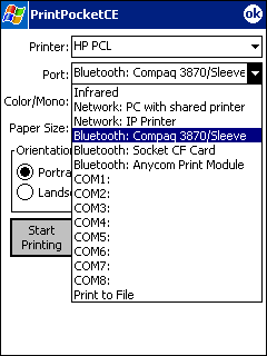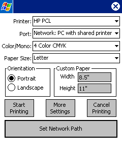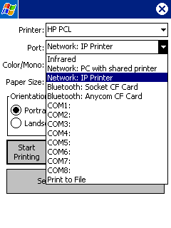 Network PC with Shared Printer: You can print to a printer that is connected to a networked "host" desktop PC as long as the printer is shared to the network. You will need the networked computer name (contact network administrator for this help and information). On your device, at the "Select Printer" screen, select the desired printer type and tap on the Port list (below left). Select "Network: PC with shared printer" (below right).