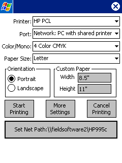 You should now see the correct printer path (below left). Tap OK and you will see the Select Printer screen with the networked printer path showing in the "Set Net Path" button (below right). Tap "Start Printing" to begin network printing.