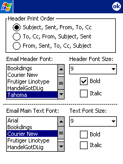 in the printed email header as well as the font info for both the